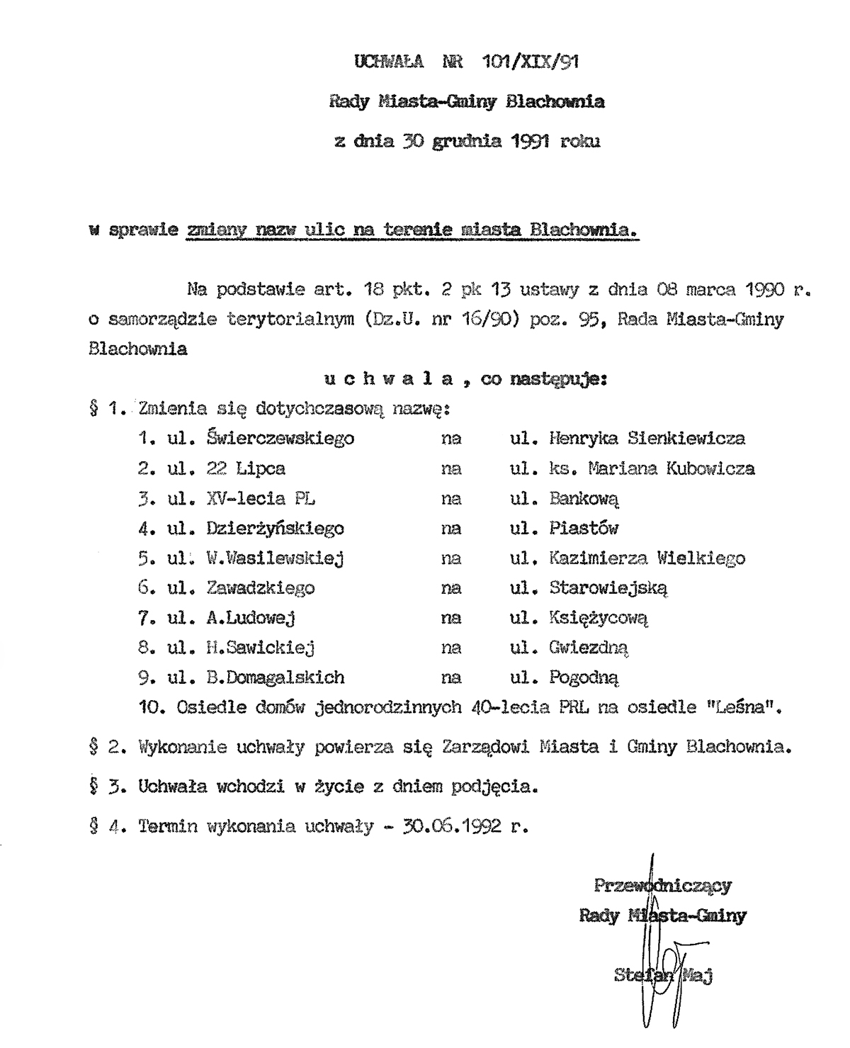 W 1991 roku zmieniono nazwy ulic w Blachowni